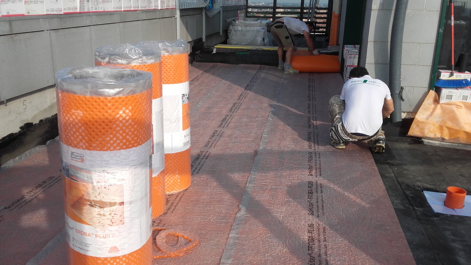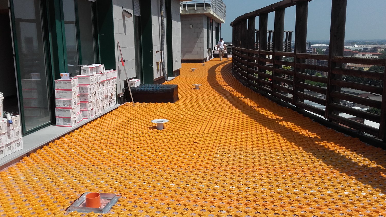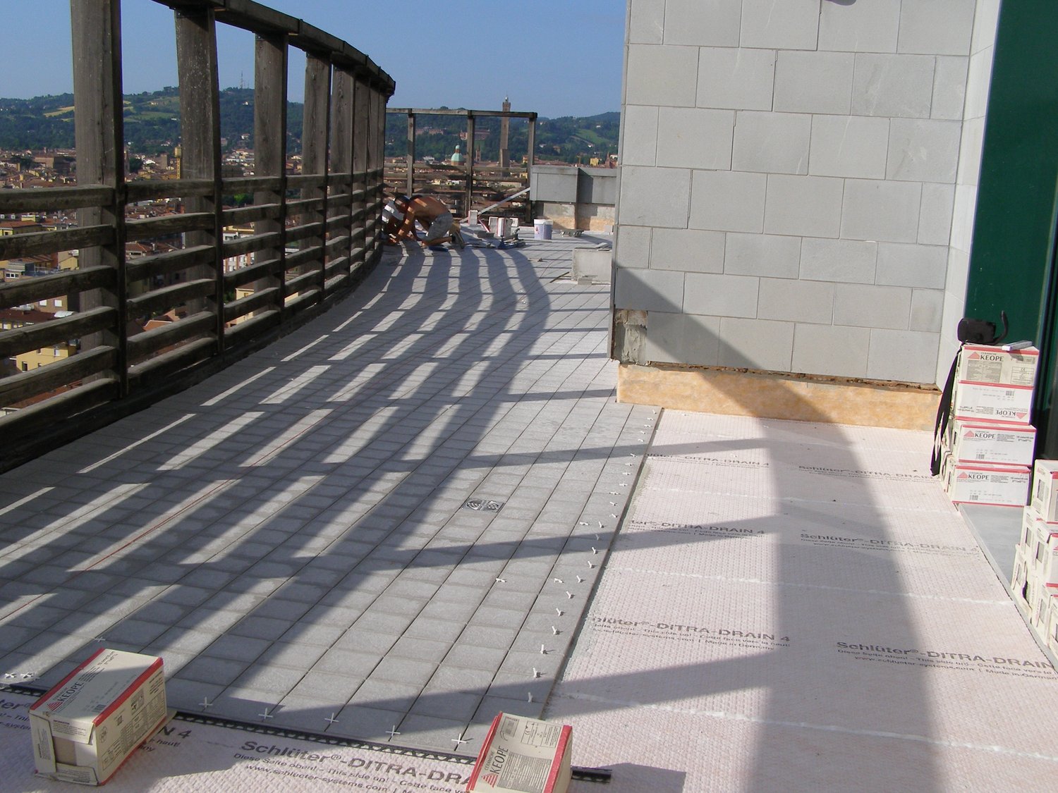 Sulla guaina bituminosa si è installato uno strato di protezione e drenaggio Schlüter®-TROBA-PLUS, in conformità con le raccomandazioni della norma UNI 11493-1 sulla posa in opera delle piastrelle ceramiche. Successivamente si è posato il prodotto di drenaggio Schlüter®-BEKOTEC-DRAIN, il quale, essendo cavo all’interno, ha permesso di realizzare un secondo massetto pendenziato di basso spessore e nettamente più leggero, oltre che più rapido per quanto riguarda i tempi di asciugatura.